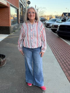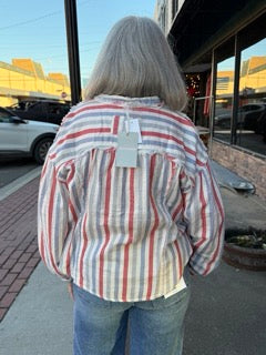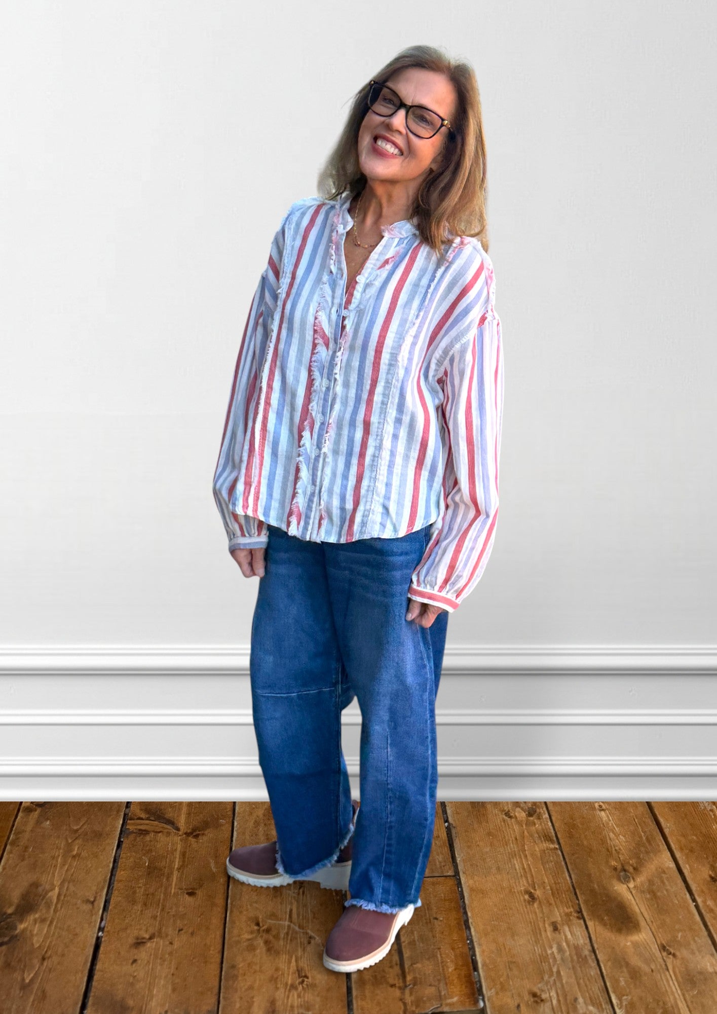 Meet your new “throw it on and look cute” essential 💕 The ee:Some Berry Breeze Soft Washed Stripe Frayed Trim Shirt is lightweight, easy, and effortlessly stylish — aka everything we want in a boutique top.