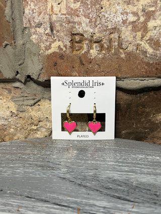 Splendid Iris Earrings - Plain Huggies with Colorful Heart Drop, Bright Pink, Gold