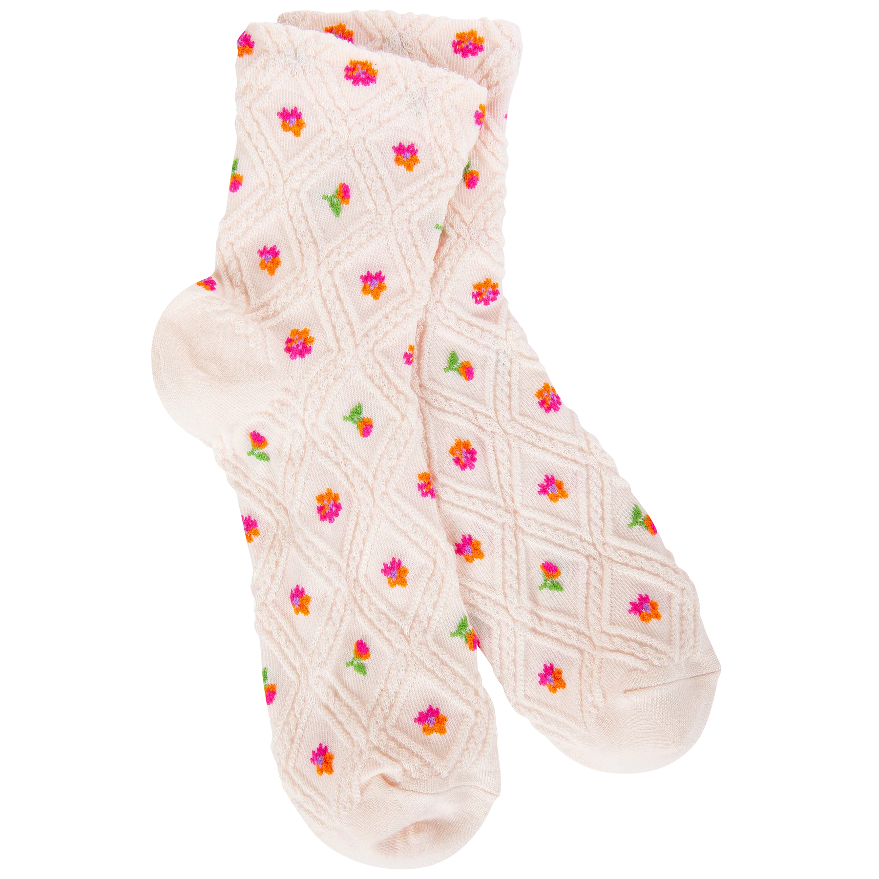 Designed with a soft neutral base and delicate pink and orange floral bud details, these socks add the perfect subtle pop of color while keeping your feet wrapped in cloud-like comfort. Perfect for lounging, layering with boots, or gifting someone a cozy surprise.