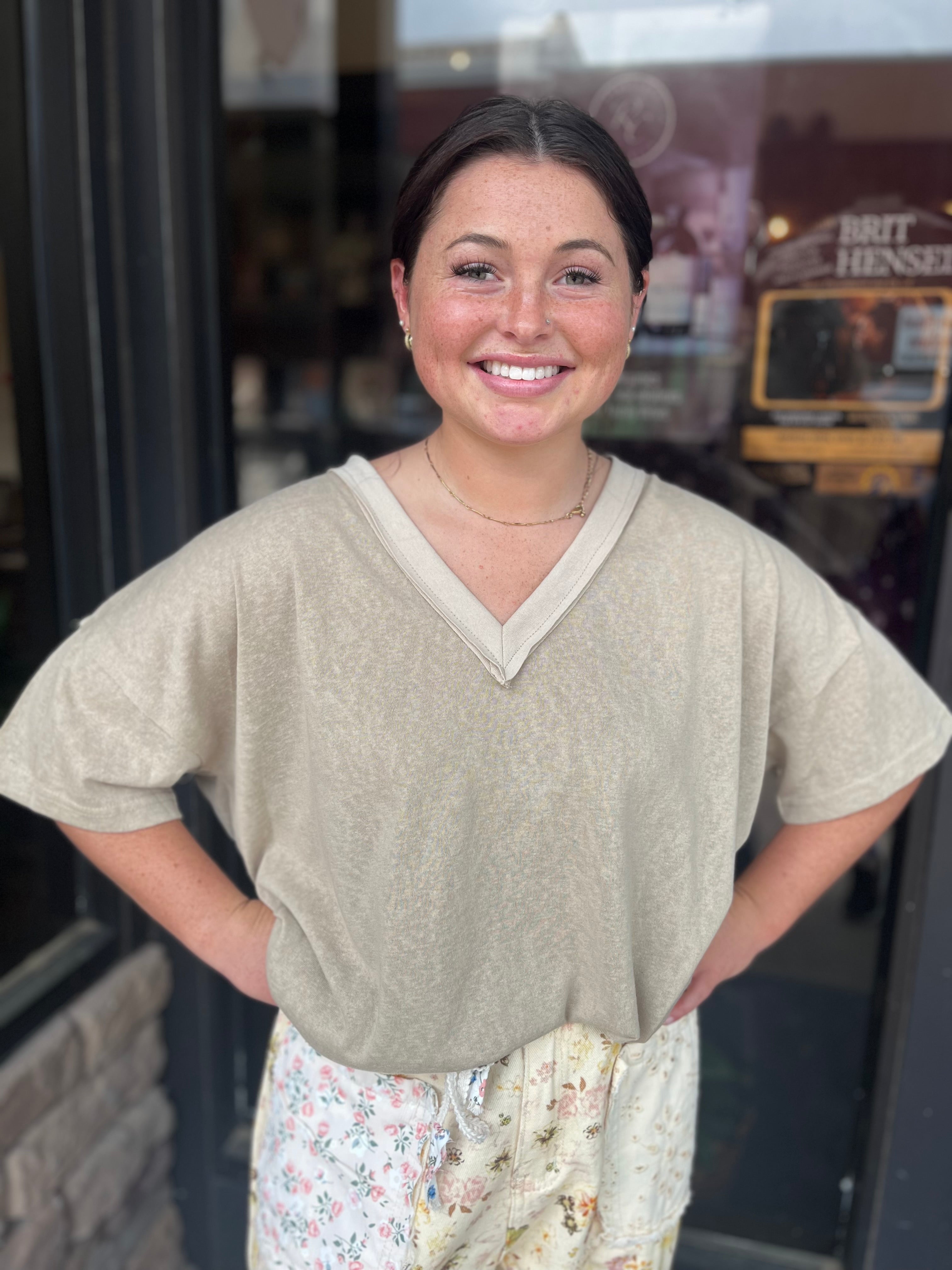 Soft Neutrals & Everyday Comfort: POL Clothing Latte V-Neck Short Sleeve Stone Washed Knit Top